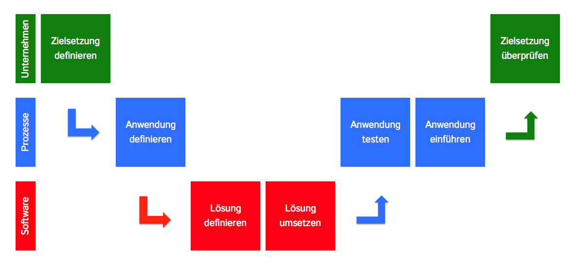 Nun zu den Ebenen. Grün ist die Unternehmensführung, blau sind die Prozesse und rot die gesuchten Hilfsmittel. Allen Aufgaben voran geht die unternehmerische Zielsetzung, gefolgt von den abhängigen Prozessen und den dafür erforderlichen Hilfsmitteln – in unserem Fall ist dies Software. Erfahre in den folgenden drei Punkten, wer auf der jeweiligen Ebene verantwortlich ist und was geklärt sein muss.