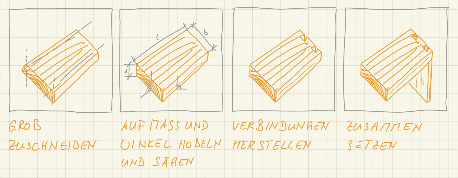 Um Möbel herzustellen, durchläuft das Holz vier Arbeitsschritte. Zuerst werden die Klotzbretter in Bild 1 grob zugeschnitten. In Bild 2 werden sie auf Mass gebracht. Bild 3 zeigt das Erstellen von Verbindungen und Bild 4 den Zusammenbau.