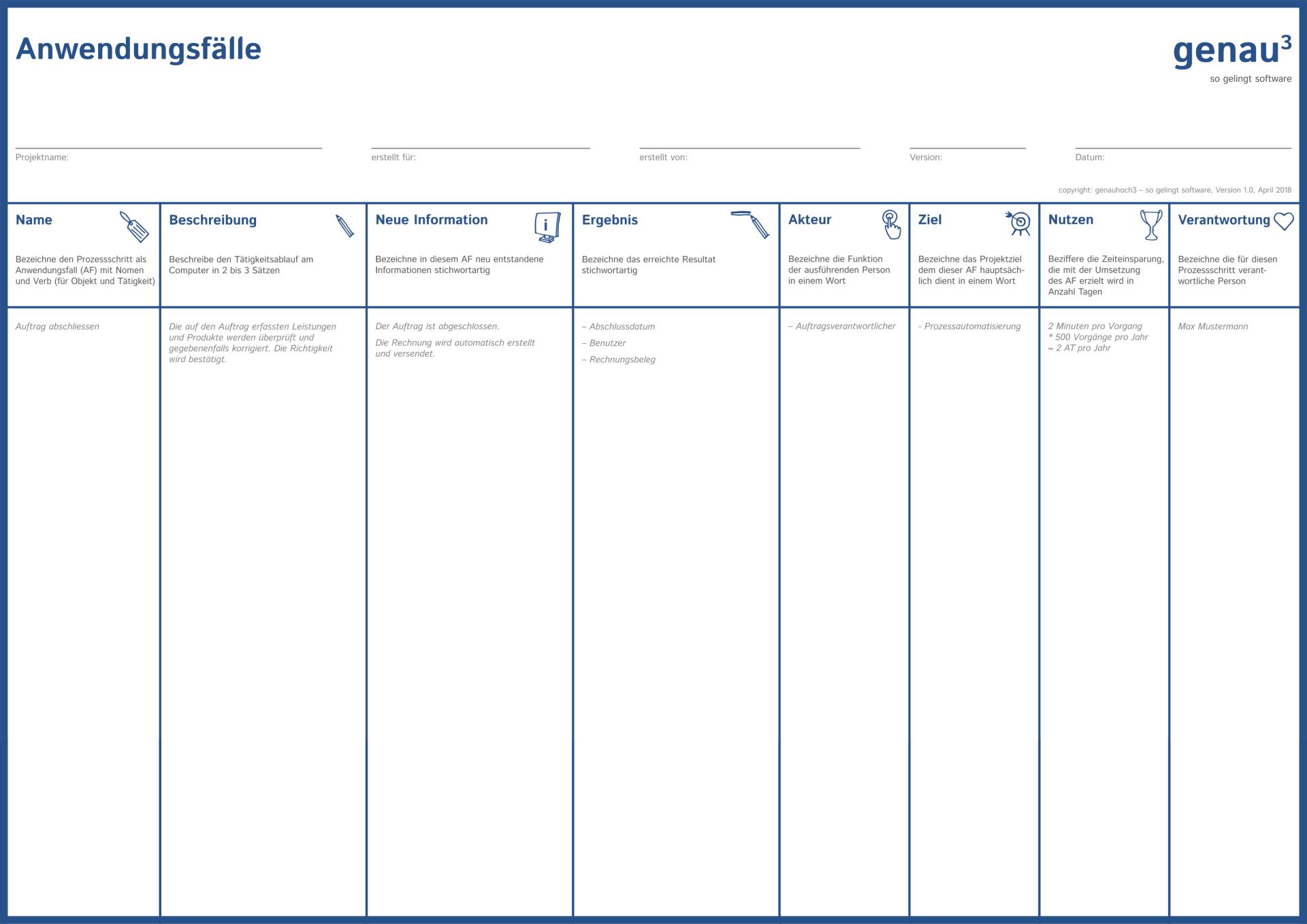 Lade Dir meine Vorlage zum Erarbeiten der Anwendungsfälle herunter. Ich selber nutze sie gerne als A0-Plakat und arbeite mit Haftnotizen.